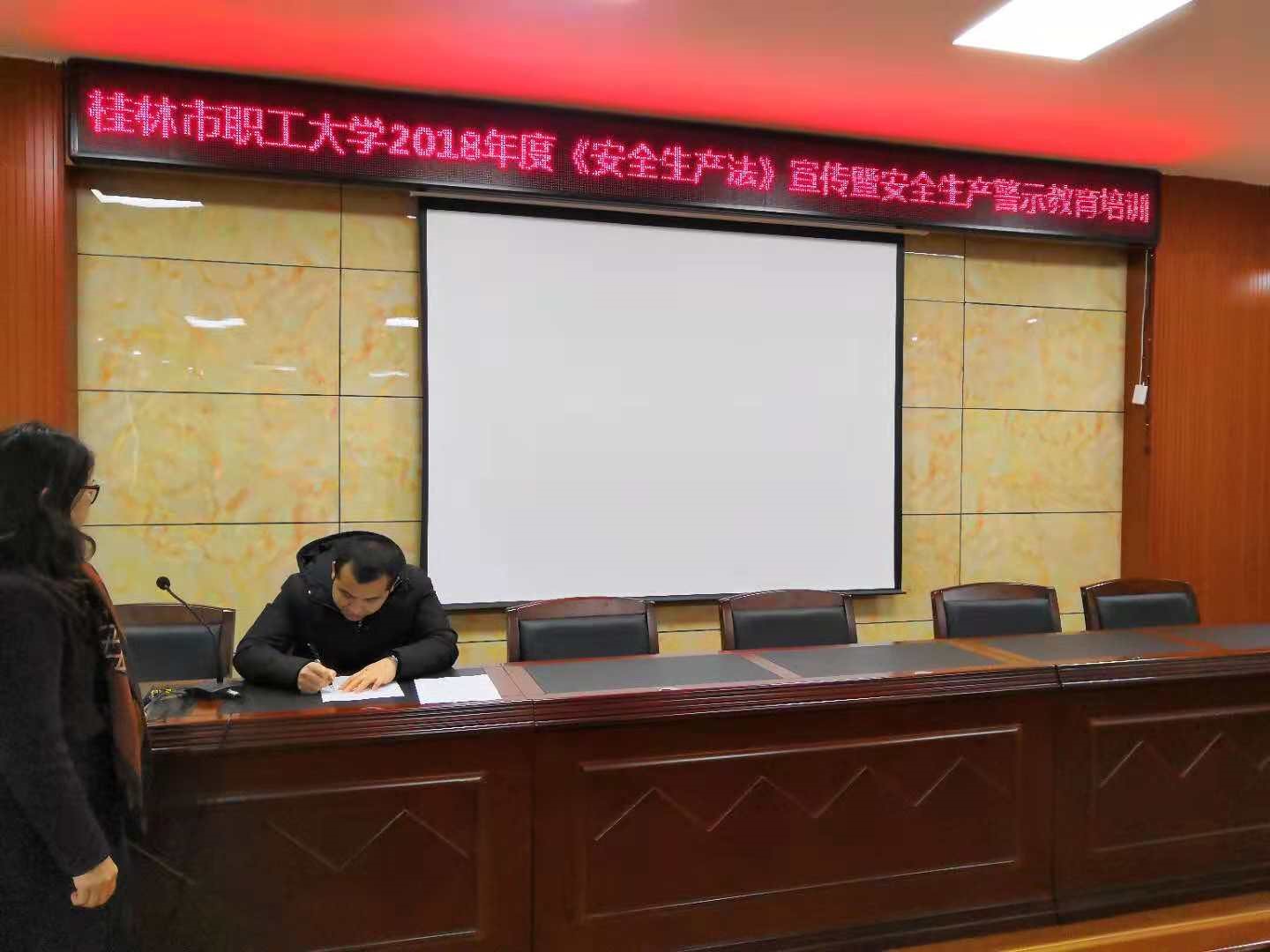 2018年12月6日桂林市職工大學(xué)組織全體教職工及各門面租戶認(rèn)真學(xué)習(xí)了《安全生產(chǎn)法》并觀看了安全生產(chǎn)警示教育片。會上龍云枝副校長給大家詳細的解讀了《安全生產(chǎn)法》并布置了自治區(qū)成立60周年慶?;顒悠陂g及今冬明春期間的社會治安綜合治理穩(wěn)定的工作安排和要求,學(xué)校后勤保障工作部向各門面租戶發(fā)放了社會治安綜合治理穩(wěn)定及門面衛(wèi)生工作的告知書。培訓(xùn)結(jié)束后,詹靖校長提出了三點要求:一是參加培訓(xùn)的各門面的代表要將學(xué)校的相關(guān)要求及培訓(xùn)的知識及時傳達到每位員工,學(xué)校部門分管領(lǐng)導(dǎo)要具體抓好落實;二是大家要增強安全生產(chǎn)紅線意識,繃緊安全生產(chǎn)這根弦不能放松;三是進步一完善安全生產(chǎn)監(jiān)管體制,提升應(yīng)急能力。