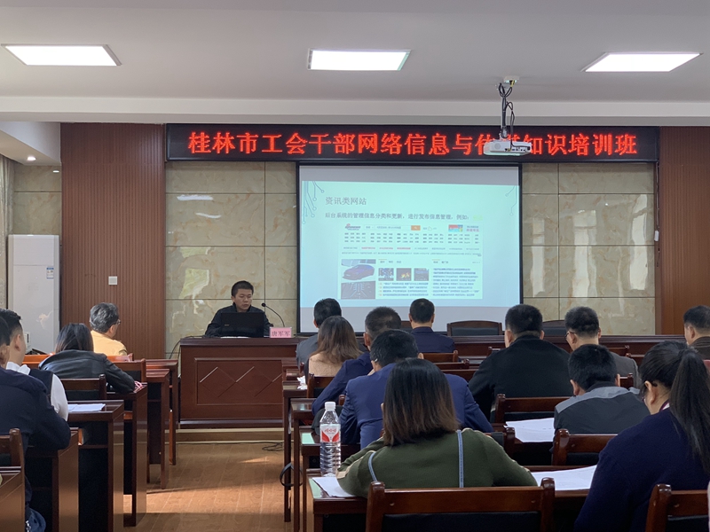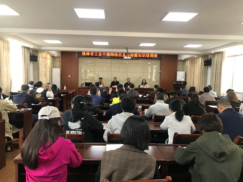 2019年11月14日,桂林市工會干部網絡信息與傳媒知識培訓班在我校舉辦。來自各縣(市)區(qū)總工會、各產業(yè)工會、部分市總直管基層工會專兼職工會干部,以及我校全體教職工參加此次培訓班。桂林市總工會掛職副主席黃錦堂、桂林市工會干部學校(桂林市職工大學)校長詹靖、桂林市總工會網絡工作部周堅部長、玉明副部長參加開班儀式。
