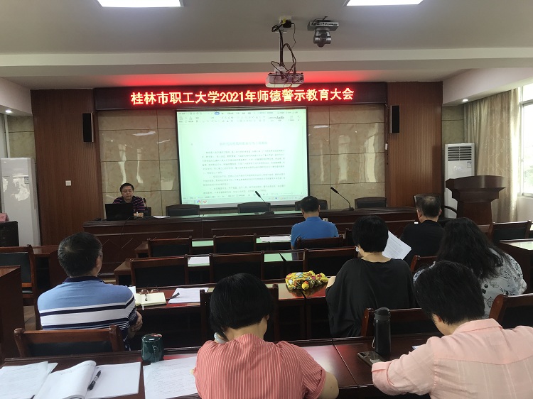 為進一步加強師德師風(fēng)建設(shè),堅守教育初心,增強紀(jì)律意識,6月3日,桂林市職工大學(xué)在131多媒體教室召開師德警示教育大會,全校教師參加了會議。