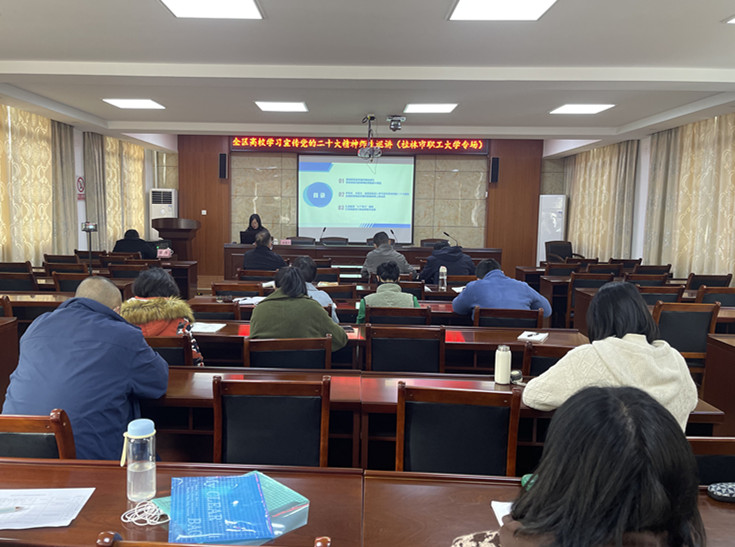 為深入學(xué)習(xí)宣傳貫徹黨的二十大精神,更好地團(tuán)結(jié)引領(lǐng)廣大教職工聽(tīng)黨話、跟黨走,把力量凝聚到黨的二十大確定的各項(xiàng)任務(wù)上來(lái),根據(jù)上級(jí)決策部署和學(xué)校工作安排,12月15日上午,全區(qū)高校學(xué)習(xí)宣傳黨的二十大精神師生巡講團(tuán)到我校開(kāi)展專題宣講。學(xué)校全體教職工參加了會(huì)議。會(huì)議由黨支部副書記劉庚主持。