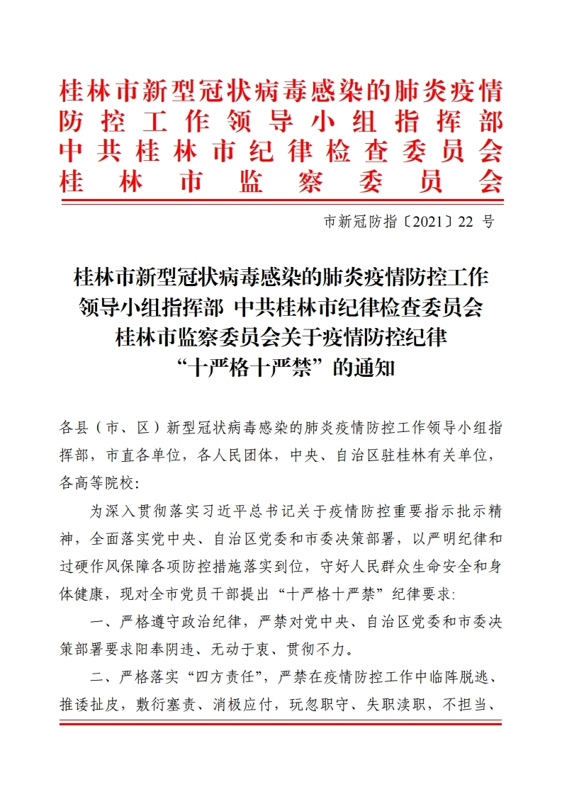 桂林市監(jiān)察委員會關(guān)于疫情防控紀(jì)律“十嚴(yán)格十嚴(yán)禁”的通知