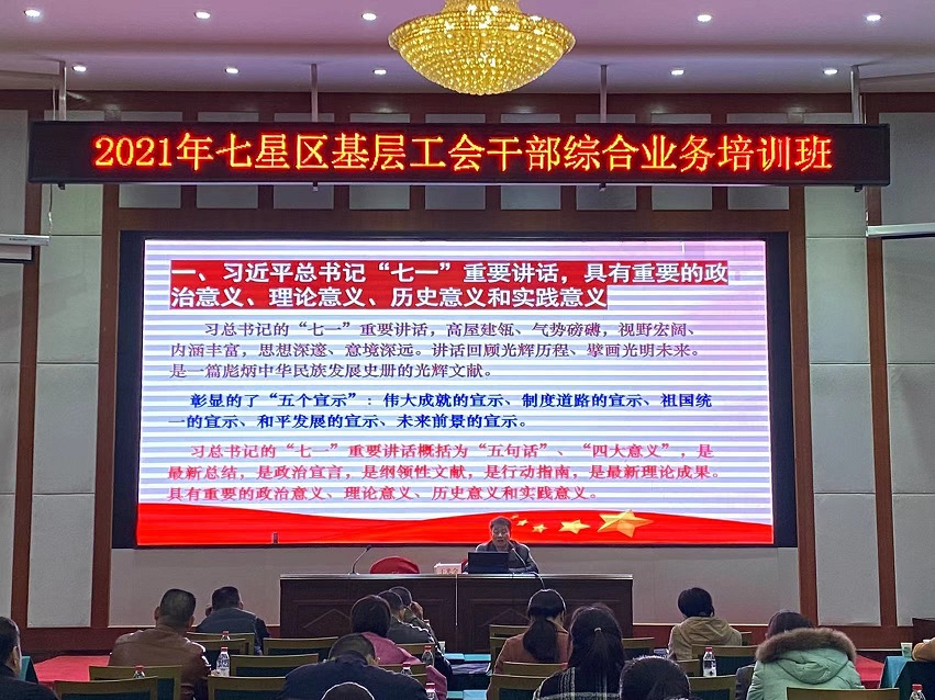 為進一步提高各基層工會主席的理論素質(zhì)和業(yè)務(wù)水平,拓寬知識面,提高業(yè)務(wù)素質(zhì)和實際操作能力,2021年11月11日由桂林市七星區(qū)總工會主辦,桂林市職工大學(xué)承辦的2021年七星區(qū)基層工會干部綜合業(yè)務(wù)培訓(xùn)班順利開班。參加此次培訓(xùn)的學(xué)員共90人,主要來自七星區(qū)工會以及街道、園區(qū)、企業(yè)、社區(qū)的工會主席及負(fù)責(zé)人。