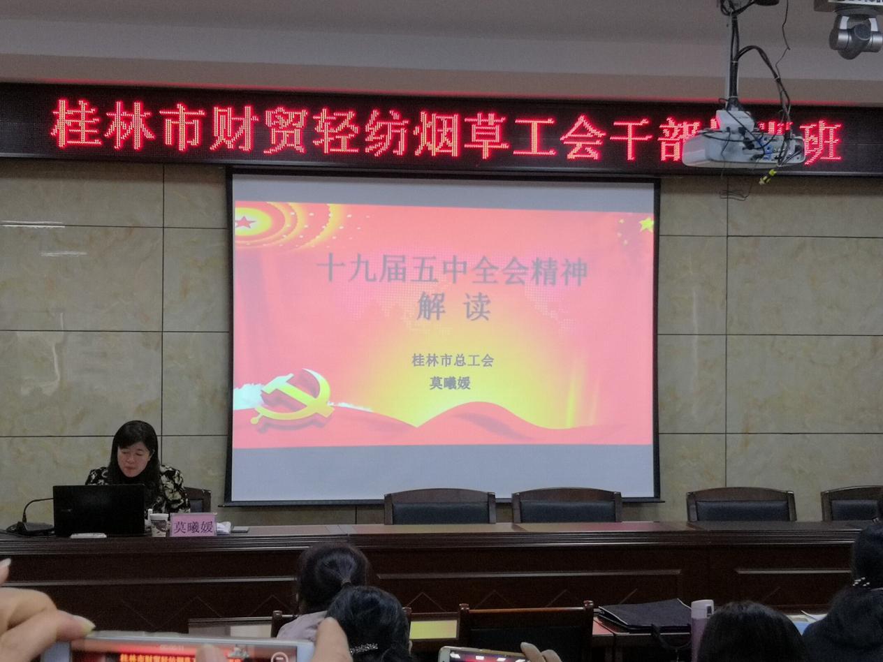會議首先由桂林市總工會黨組成員、副主席莫曦媛同志對十九屆五中全會精神作了深入淺出的解讀。本次培訓還邀請市總工會和法律機構(gòu)的領(lǐng)導、專家,就廣西云平臺工會組織和會員信息錄入操作、民法典知識、工會日常工作實務(wù)等開展了專題講座。