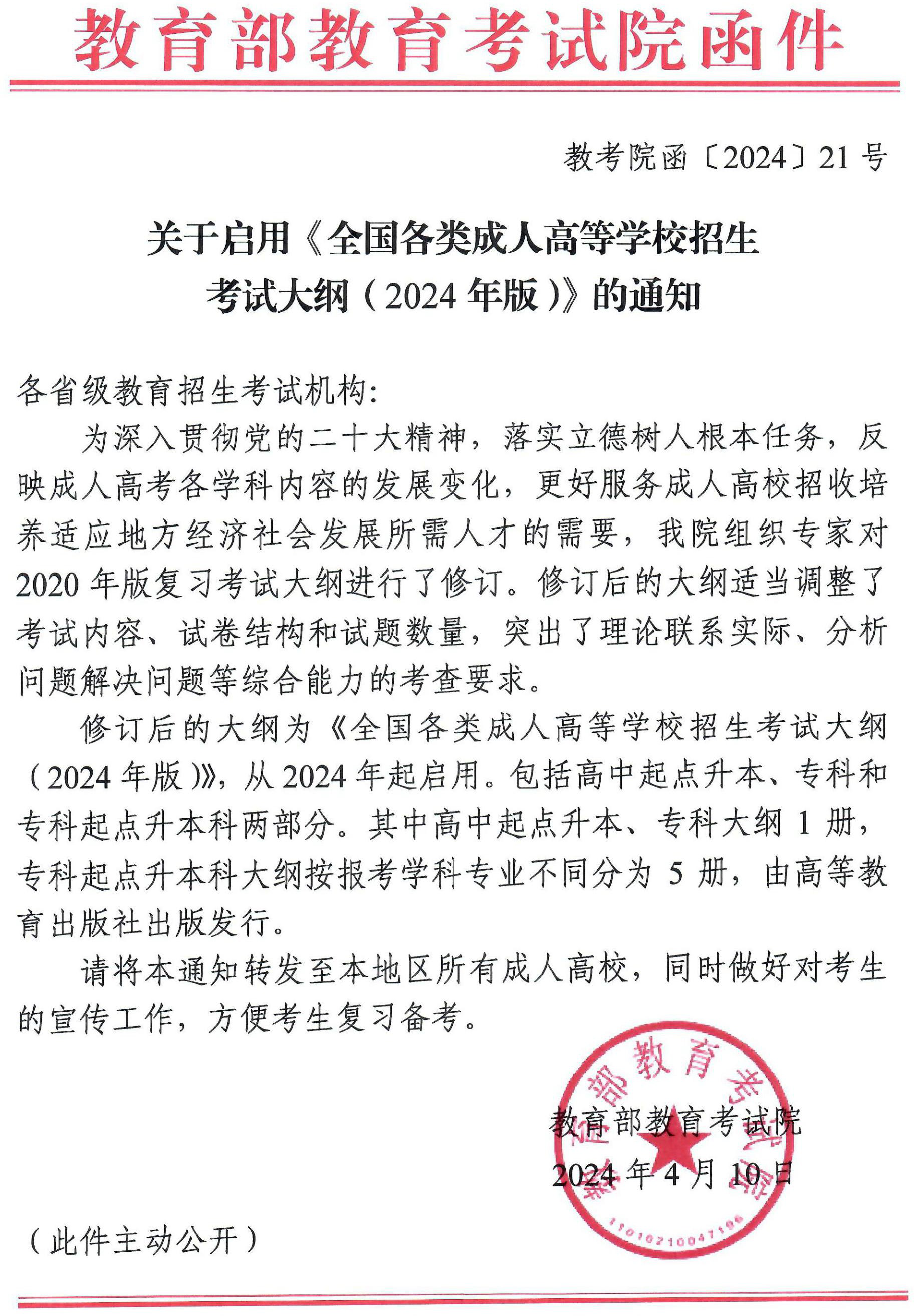 關(guān)于啟用《全國各類成人高考學(xué)校招生考試大綱 (2024 年版)》的通知