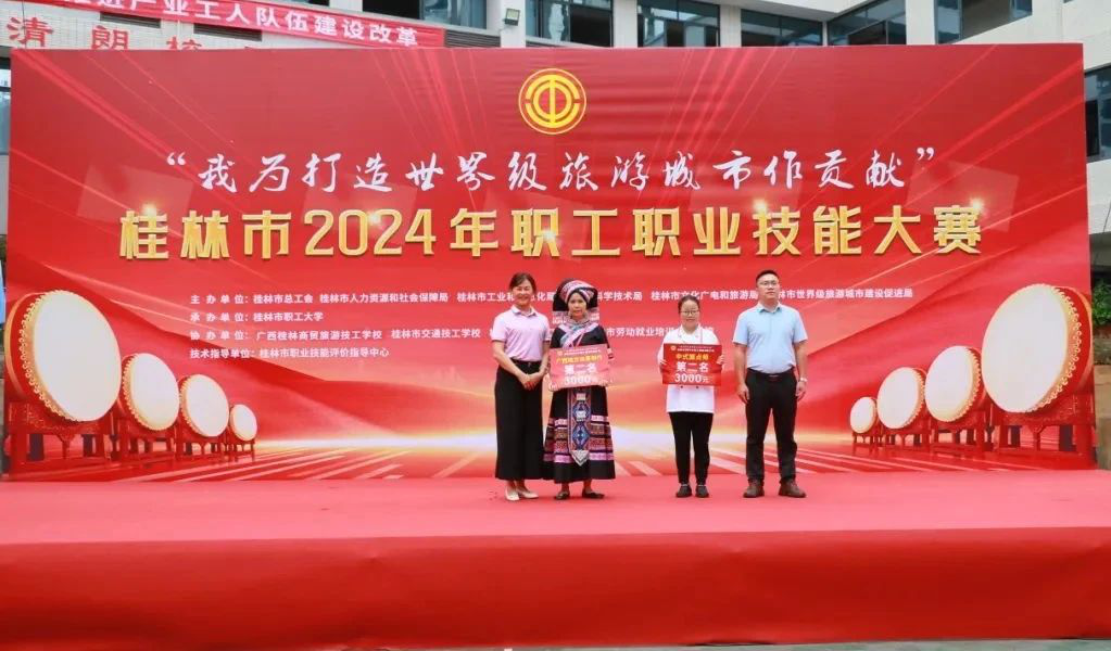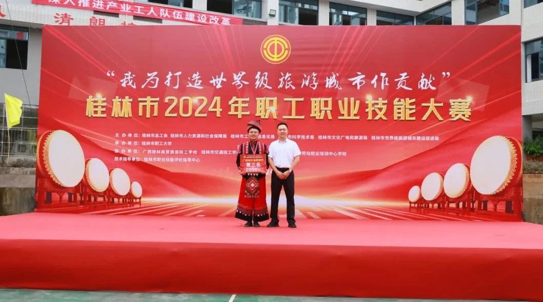 桂林市人社局職業(yè)能力建設(shè)科科長吳政鴻、桂林市總工會勞動與經(jīng)濟(jì)工作部部長葛雷為第三名選手頒獎