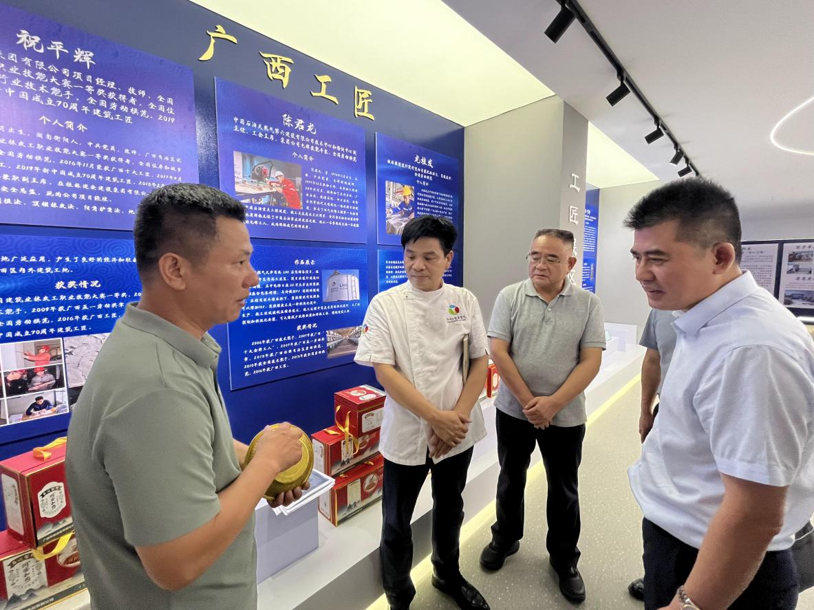 在桂林工匠展廳,調(diào)研組駐足“工匠風(fēng)華”墻前,認真聽取25 位“廣西工匠”和131位“桂林工匠”的事跡與貢獻介紹。通過實物展、代表作和影像資料,調(diào)研組深切感受到“執(zhí)著追求、精益求精、一絲不茍、追求卓越”的工匠精神內(nèi)核。期間,蘇琰凌與全國先進工作者譚興勇、自治區(qū)級非遺項目傳承人周林澤等工匠代表親切交流,細致詢問他們在技術(shù)研究、工藝創(chuàng)新、非遺傳承等方面的進展與成效,對他們長期扎根一線、專注技藝鉆研、弘揚工匠精神給予高度評價,現(xiàn)場氛圍熱烈而融洽。