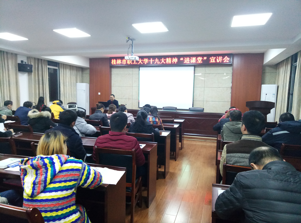 12月12日晚上,十九大精神“進課堂”宣講會在桂林市職工大學(xué)多媒體教室舉行。2016級大專班師生聆聽了報告。
