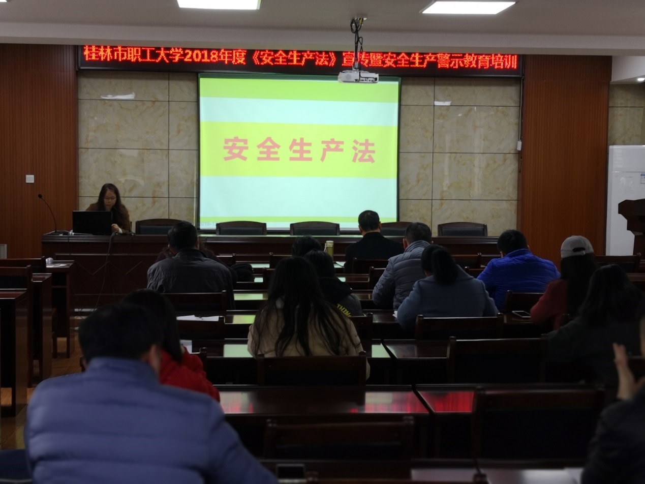 2018年12月6日桂林市職工大學(xué)組織全體教職工及各門面租戶認(rèn)真學(xué)習(xí)了《安全生產(chǎn)法》并觀看了安全生產(chǎn)警示教育片。會上龍云枝副校長給大家詳細的解讀了《安全生產(chǎn)法》并布置了自治區(qū)成立60周年慶?;顒悠陂g及今冬明春期間的社會治安綜合治理穩(wěn)定的工作安排和要求,學(xué)校后勤保障工作部向各門面租戶發(fā)放了社會治安綜合治理穩(wěn)定及門面衛(wèi)生工作的告知書。培訓(xùn)結(jié)束后,詹靖校長提出了三點要求:一是參加培訓(xùn)的各門面的代表要將學(xué)校的相關(guān)要求及培訓(xùn)的知識及時傳達到每位員工,學(xué)校部門分管領(lǐng)導(dǎo)要具體抓好落實;二是大家要增強安全生產(chǎn)紅線意識,繃緊安全生產(chǎn)這根弦不能放松;三是進步一完善安全生產(chǎn)監(jiān)管體制,提升應(yīng)急能力。