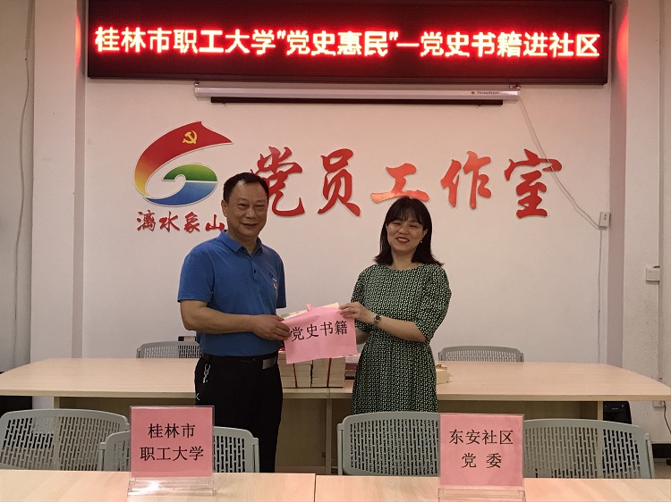 為把黨史學(xué)習(xí)教育落到實處,普及黨史知識,營造社區(qū)重視黨史、學(xué)習(xí)黨史的良好氛圍,切實為群眾辦實事辦好事,6月8日,桂林市職工大學(xué)組織黨員干部走進(jìn)大黨委共建單位象山區(qū)南門街道東安社區(qū)贈送黨史書籍,積極發(fā)揮黨史惠民、以史鑄魂作用。