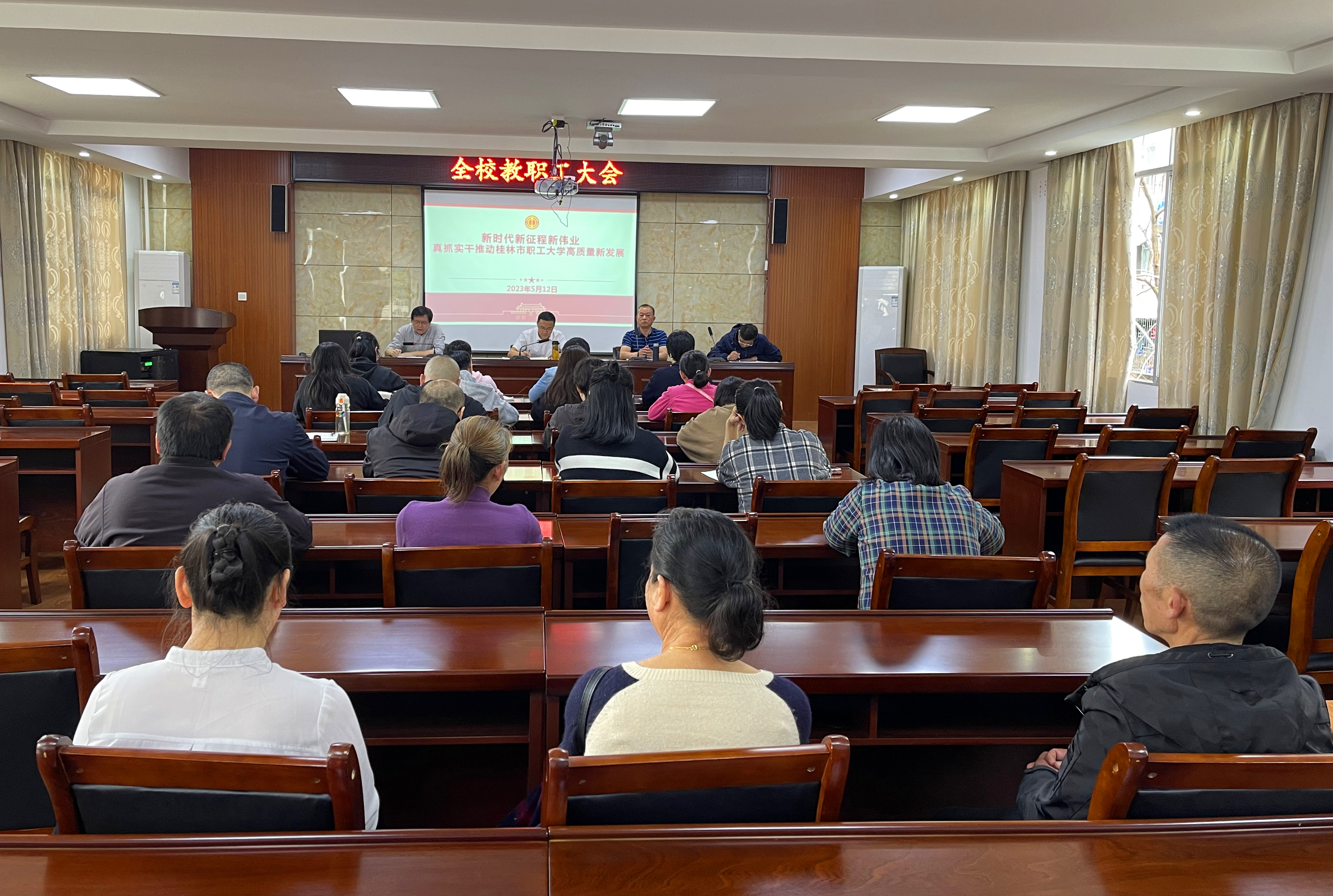 5月12日下午,桂林市職工大學(xué)召開了以“新時(shí)代新征程新偉業(yè),真抓實(shí)干推動(dòng)桂林市職工大學(xué)高質(zhì)量新發(fā)展”為主題的全體教職工會(huì)議,會(huì)議由學(xué)校副校長(zhǎng)謝永祥主持。會(huì)議分析學(xué)校發(fā)展面臨的新問題、新挑戰(zhàn),全面安排部署了近期工作,凝聚共識(shí),振奮精神,充分調(diào)動(dòng)教職工的干事創(chuàng)業(yè)熱情。
