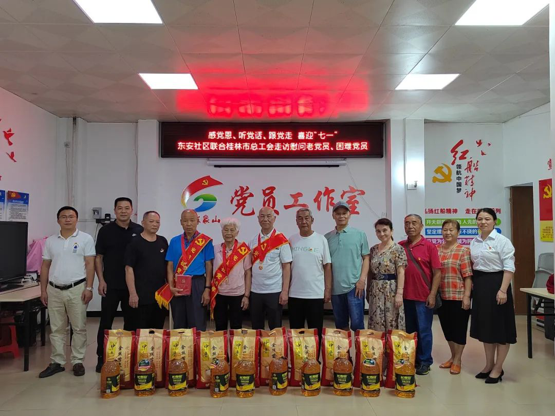 為激勵(lì)廣大黨員干部先鋒模范作用,充分體現(xiàn)黨組織對(duì)社區(qū)困難黨員和老黨員的關(guān)懷關(guān)愛,在“七一”建黨節(jié)來臨之際,桂林市職工大學(xué)與象山區(qū)南門街道東安社區(qū)開展結(jié)對(duì)共建活動(dòng),并代表桂林市總工會(huì)向社區(qū)老黨員、困難黨員送去節(jié)日問候和黨組織的關(guān)懷和溫暖。