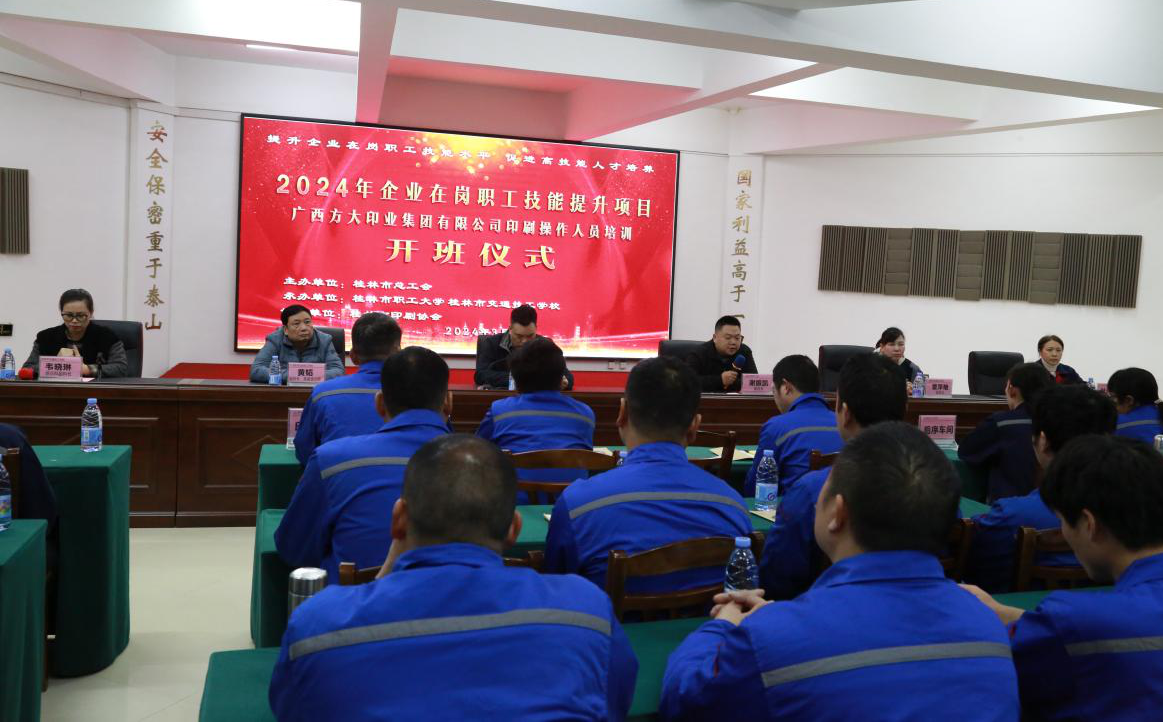 3月13日,2024年企業(yè)在崗職工(印刷操作人員)技能提升培訓班在廣西方大印業(yè)集團有限公司正式開班。此次培訓活動由桂林市總工會主辦,桂林市職工大學(桂林市工會干部學校、桂林工匠學院)和桂林市交通技工學校聯(lián)合承辦,并得到桂林市印刷協(xié)會的大力支持,旨在進一步提升企業(yè)一線職工的專業(yè)技能,為印刷行業(yè)的持續(xù)發(fā)展注入新動力。職工大學副校長謝振凱、桂林市印刷協(xié)會會長項方大和桂林交通技校副校長覃萍艷出席開班儀式并發(fā)表了熱情洋溢的動員講話。