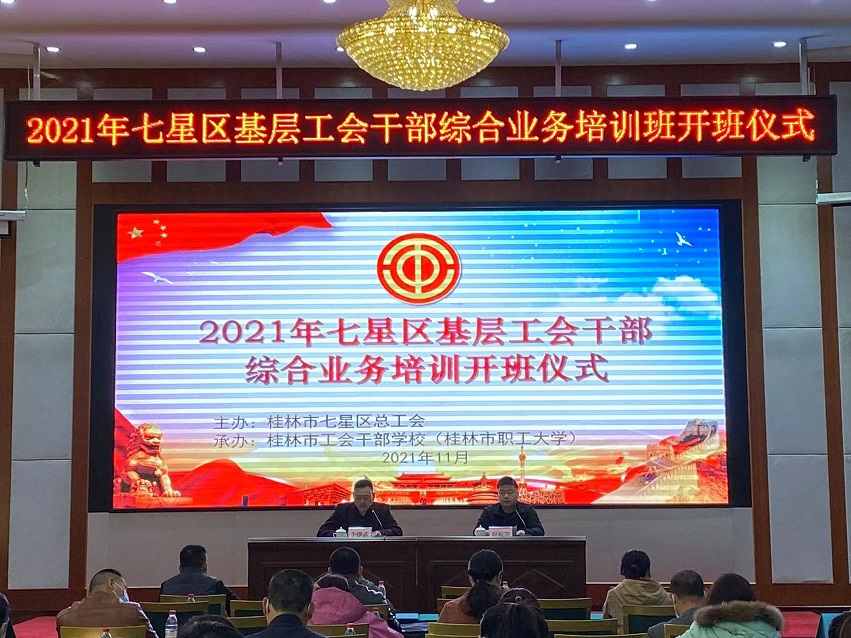 為進一步提高各基層工會主席的理論素質(zhì)和業(yè)務(wù)水平,拓寬知識面,提高業(yè)務(wù)素質(zhì)和實際操作能力,2021年11月11日由桂林市七星區(qū)總工會主辦,桂林市職工大學(xué)承辦的2021年七星區(qū)基層工會干部綜合業(yè)務(wù)培訓(xùn)班順利開班。參加此次培訓(xùn)的學(xué)員共90人,主要來自七星區(qū)工會以及街道、園區(qū)、企業(yè)、社區(qū)的工會主席及負(fù)責(zé)人。