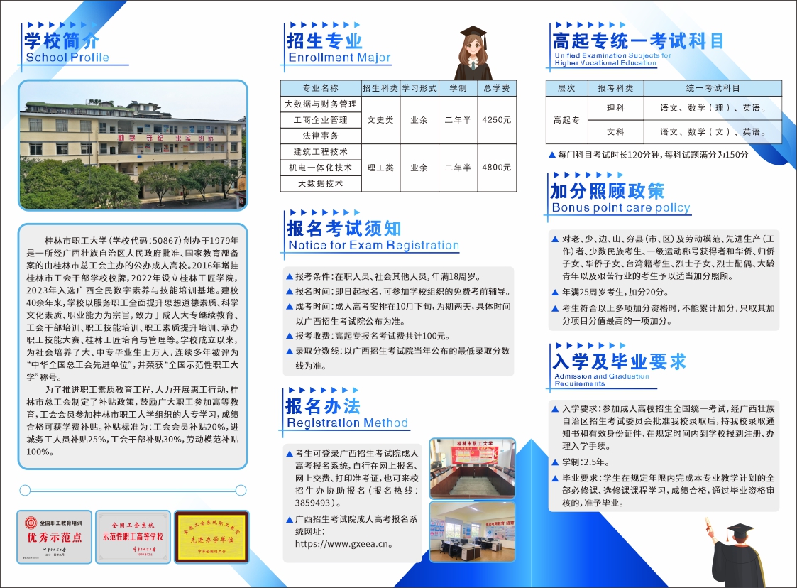 桂林市職工大學(xué)(學(xué)校代碼:50867)創(chuàng)辦于1979年是一所經(jīng)廣西壯族自治區(qū)人民政府批準(zhǔn)、國(guó)家教育部備案的由桂林市總工會(huì)主辦的公辦成人高校。2016年增掛桂林市工會(huì)干部學(xué)校校牌,2022年設(shè)立桂林工匠學(xué)院,2023年入選廣西全民數(shù)字素養(yǎng)與技能培訓(xùn)基地。建校40余年來(lái),學(xué)校以服務(wù)職工全面提升思想道德素質(zhì)、科學(xué)文化素質(zhì)、職業(yè)能力為宗旨,致力于成人大專(zhuān)繼續(xù)教育、工會(huì)干部培訓(xùn)、職工技能培訓(xùn)、職工素質(zhì)提升培訓(xùn)、承辦職工技能大賽、桂林工匠培育與管理等。學(xué)校成立以來(lái),為社會(huì)培養(yǎng)了大、中專(zhuān)畢業(yè)生上萬(wàn)人,連續(xù)多年被評(píng)為“中華全國(guó)總工會(huì)先進(jìn)單位”,并榮獲“全國(guó)示范性職工大學(xué)”稱(chēng)號(hào)。