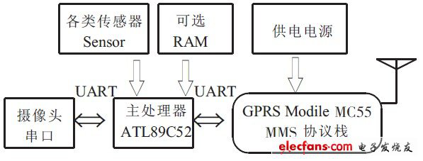采用單片機AT89C52 為核心組成彩信報警系統(tǒng),AT89C52 具有快速8051 內核、8kBFlashE2PROM、256BIDATARAM,符合該硬件要求;彩信報警功能,采用GPRSModule 的MC55 芯片,帶彩信協(xié)議棧MMS 功能;利用串口攝像頭實現(xiàn)現(xiàn)場捕獲和圖像壓縮存儲功能。